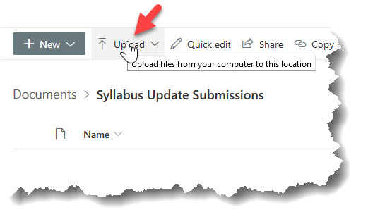 When you click the black-and-red button below, the Syllabus Update Submissions site will open in a new browser tab. Use the Upload function on the toolbar (shown) to upload your syllabus update file.